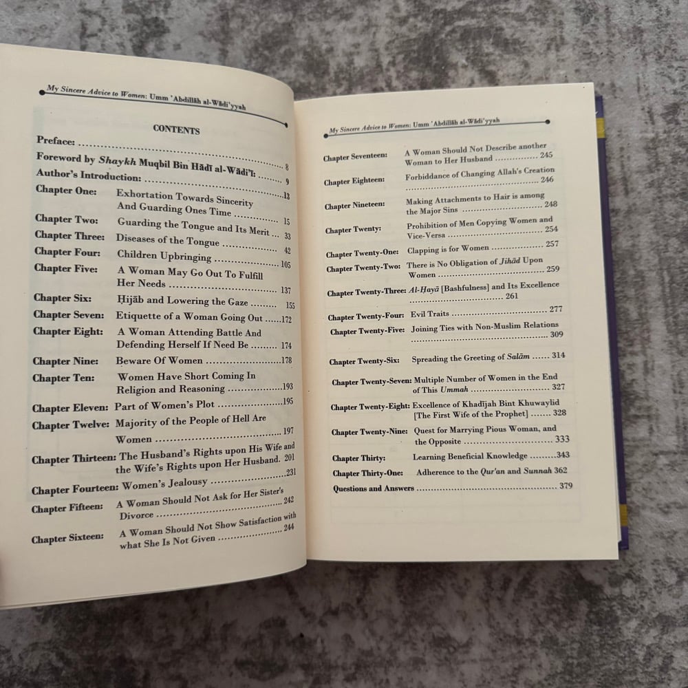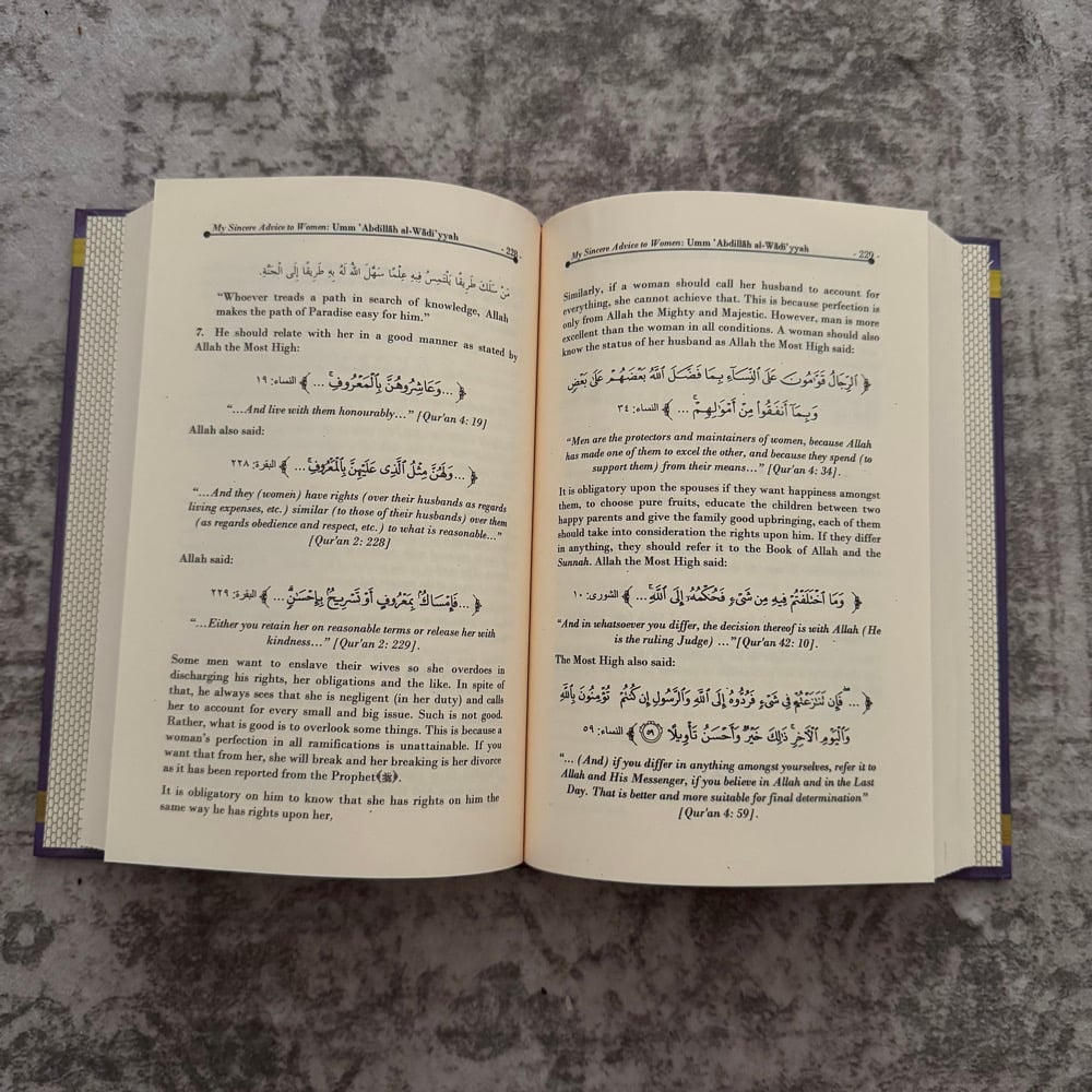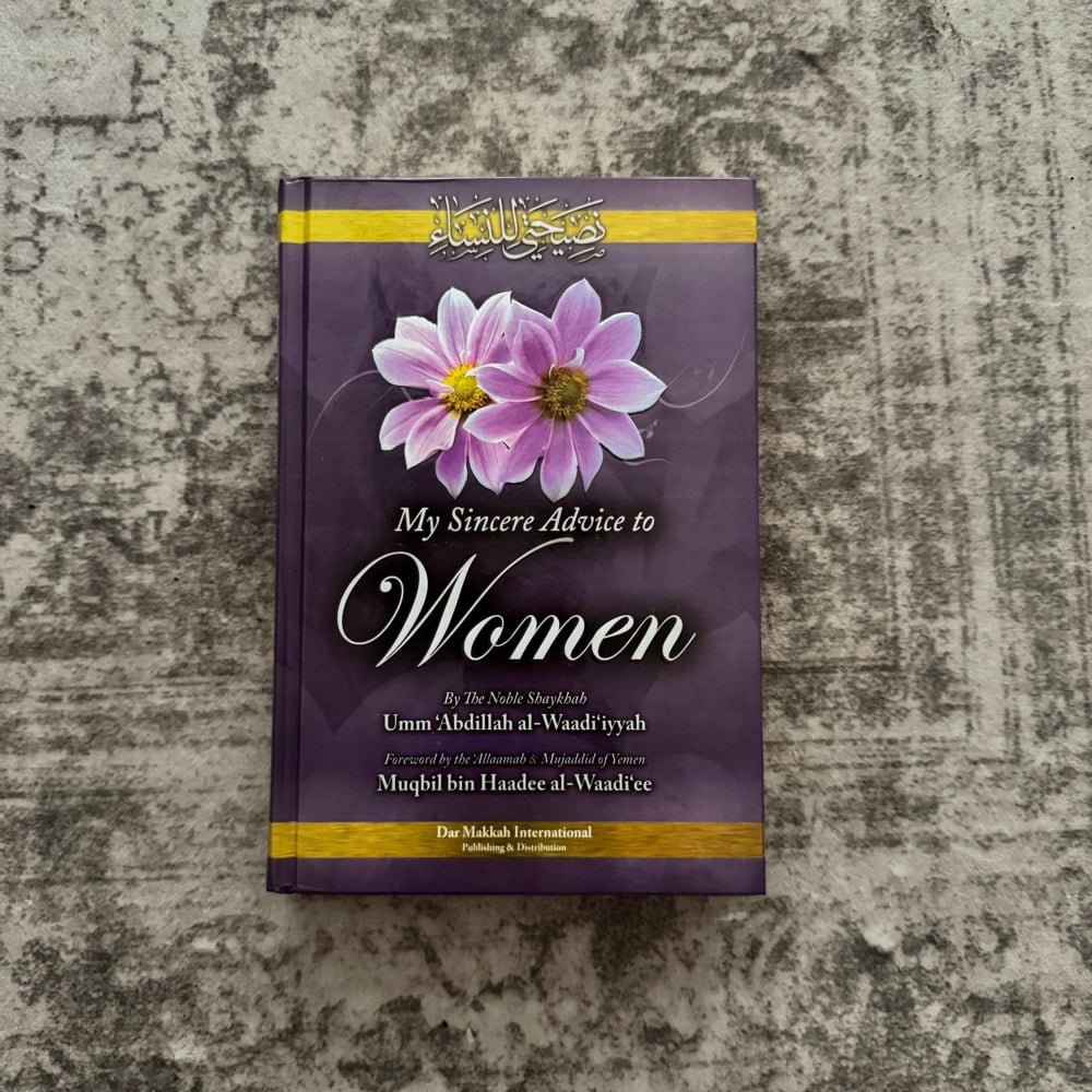 My Sincere Advice to Women by Umm ʿAbdullah al-Wādiʿiyyah is a straightforward, heartfelt reminder to Muslim women to prioritize their relationship with Allah by holding firmly to the Qur’an and authentic Sunnah, honoring modesty, and protecting their homes, hearts, and families from influences that weaken faith. The author stresses the importance of seeking knowledge, avoiding innovations, guarding one’s character, and following the example of the righteous women of Islam. She encourages women to cultivate taqwā, sincerity, patience, and humility, reminding them that true success lies not in worldly trends but in obedience to Allah and preparation for the Hereafter.