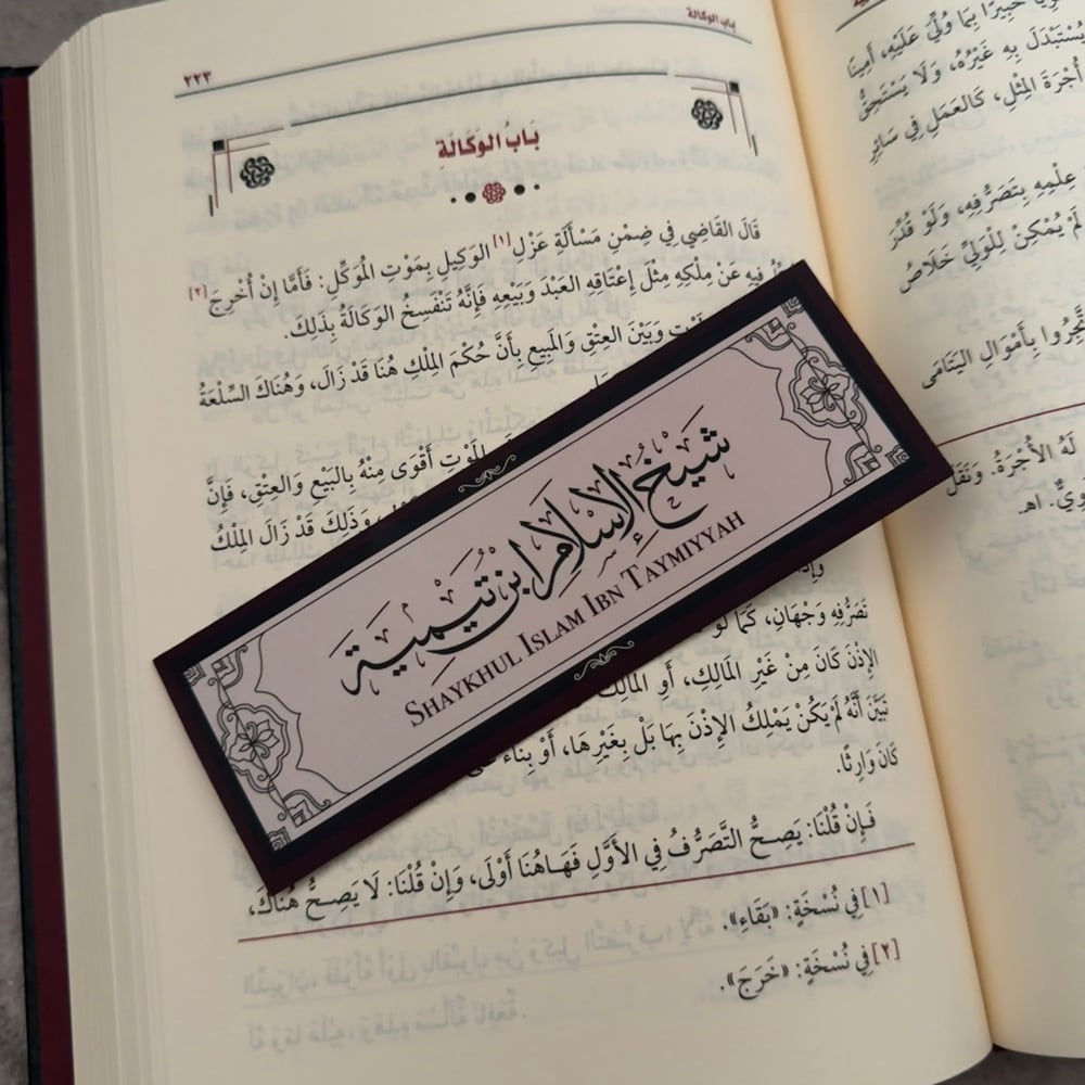 A beautiful bookmark featuring elegant calligraphy of Shaykh al-Islam Ibn Taymiyyah رحمه الله, designed in a rich maroon, black, and beige palette inspired by the classic, timeless hardcovers found in the libraries of the أهل العلم.